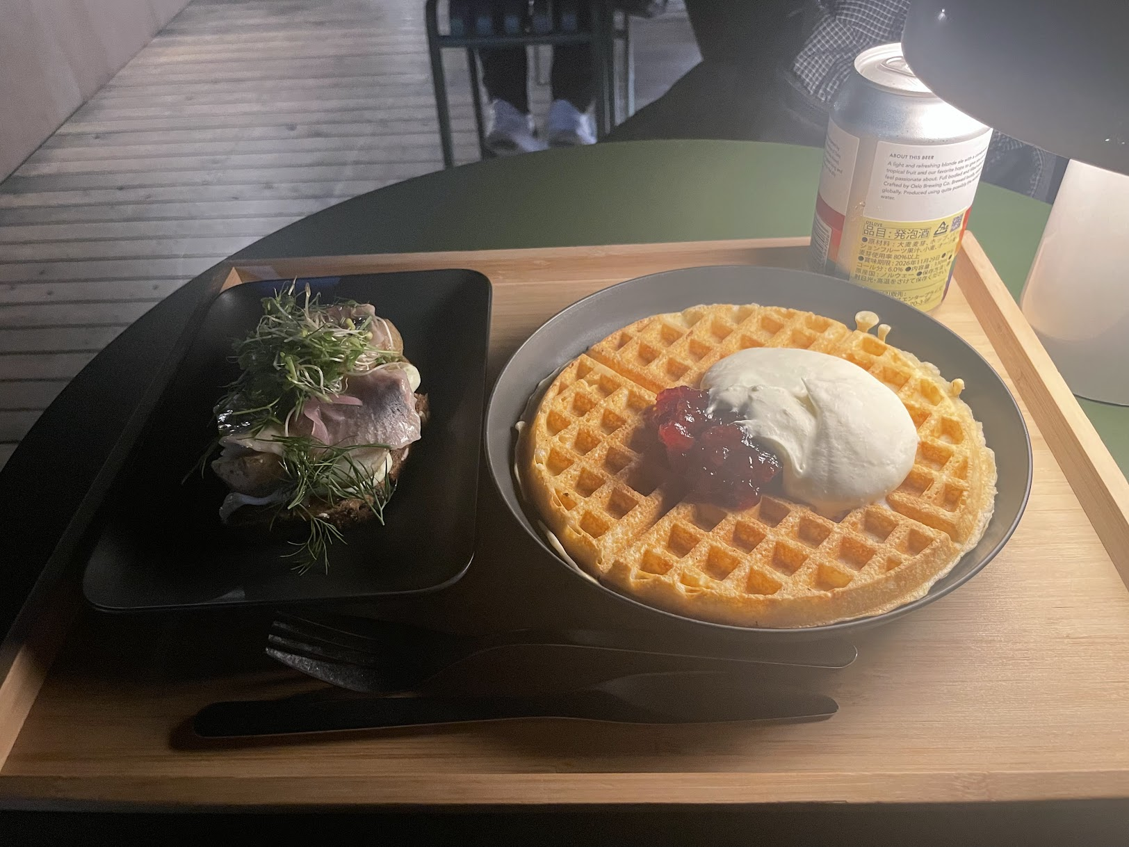 意外と穴場だった北欧パビリオンのレストラン。ニシンのスモーブローは美味しかったけれど結構わさびが強かった。ワッフルは、ワッフル。