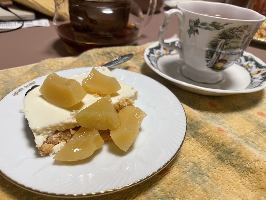 工程はタイトルに違わず簡単だったけれども、やったことのない工程や使ったことのない道具を使うのは少し不安。ビスケットを砕くのってこのくらいでいいのかな。クリームの泡立てってこれであっているのかな、ゼラチンをふやかすのに大さじ1の水って、全然足りてないじゃんねとか。まあ色々失敗とか反省とかはあるけれども、完成してしまえばそれでよし!味もヨーグルトの爽やかな酸味と桃の甘みがちょうど良くて美味しかった。次は何を作ろうかな。